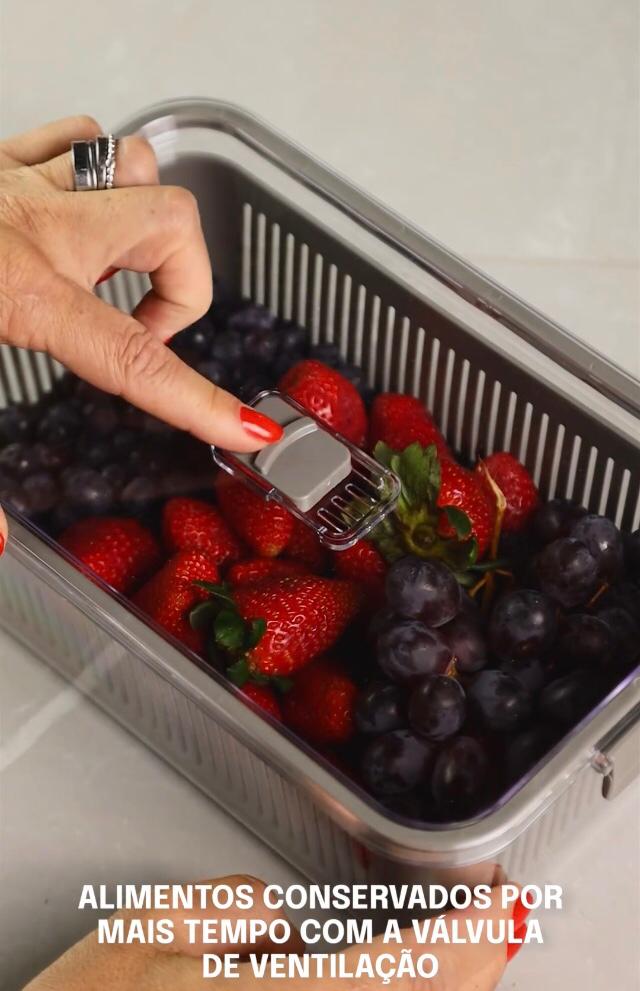 A tampa com ventilação ajustável mantém o nível de umidade ideal para cada tipo de alimento, mantendo-os frescos por mais tempo
